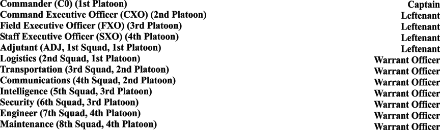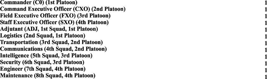 In some actual field operations instances, the Adjutant may command a 5th Platoon, depending on the mission of the unit organization. The Squad Officers would still be Warrant Officers and the muster would be the same as other Platoons. Only the assignment, which may be as redundant as the mission might require, is different.