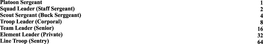 It's apparent that there are two Squads to each Platoon, giving some clue as to the mission of each Platoon within the company. Non-Commissioned Officer (NCO) and enlisted muster is: